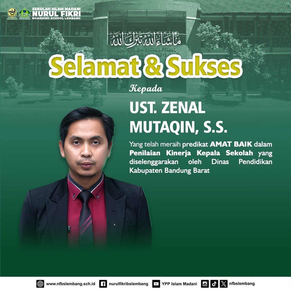 Selamat yang sebesar-besarnya kepada Ustadz Zenal Mutaqin atas pencapaian luar biasanya! Dengan bangga kami mengucapkan selamat atas meraihnya predikat amat baik dalam penilaian kinerja kepala sekolah yang diadakan oleh Dinas Pendidikan Kabupaten Bandung Barat. Prestasi ini adalah bukti nyata dari dedikasi dan komitmen yang luar biasa dalam memberikan yang terbaik bagi dunia pendidikan. Semangat dan inspirasi yang Anda pancarkan tidak hanya membanggakan, tetapi juga memberikan dorongan positif bagi seluruh komunitas pendidikan. Teruslah menjadi teladan yang gemilang, Ustadz Zenal Mutaqin!