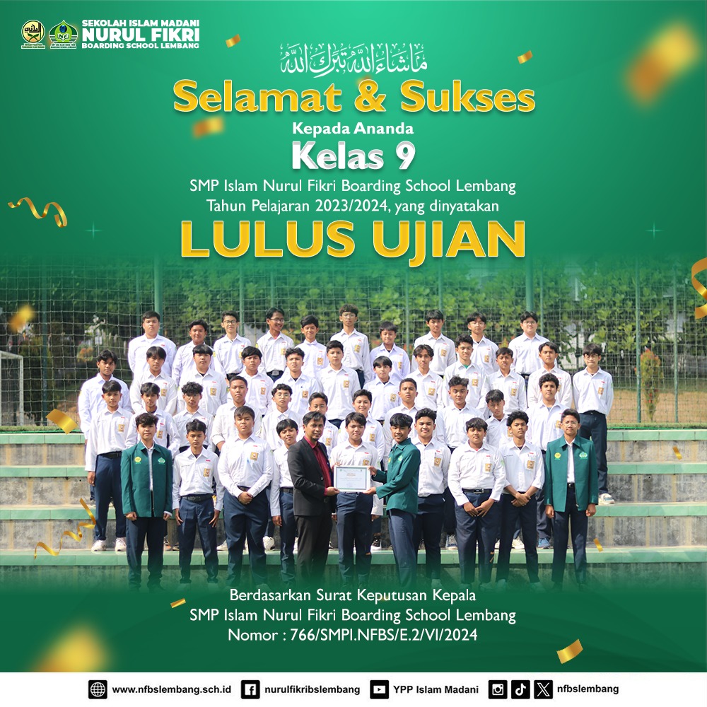 Alhamdulillah, segala puji bagi Allah SWT yang telah memberikan rahmat dan karunia-Nya sehingga kita dapat menyaksikan keberhasilan yang membanggakan ini. Dengan hati yang penuh sukacita, kami mengucapkan selamat yang sebesar-besarnya kepada seluruh siswa-siswi kelas 9 SMP Nurul Fikri Boarding School Lembang yang telah lulus ujian dengan gemilang.